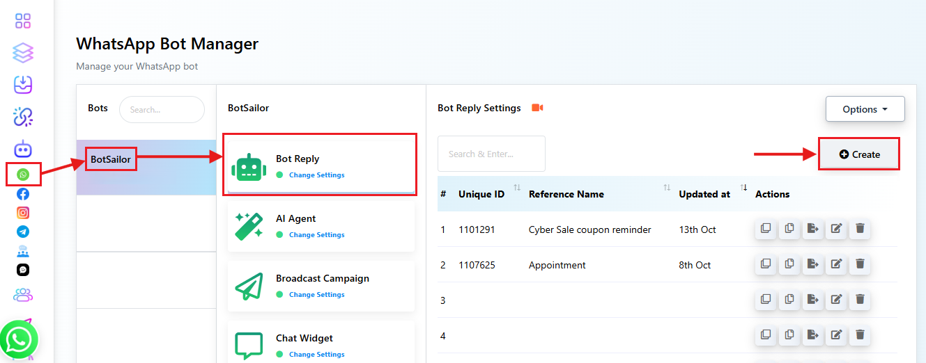- Click on the Chatbot Manager → Navigate WhatsApp Bot Menu