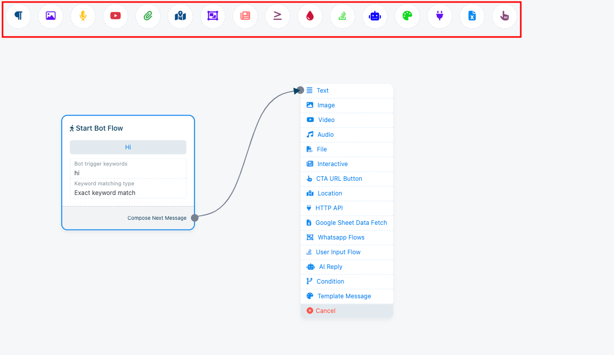 Instantly, a bot flow-builder canvas will appear shown in the following screenshot. The marked zone shows the various components you can use to configure your chatbot’s action.