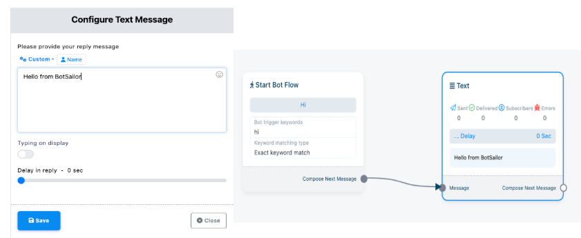 To be honest, once you get comfortable with this drag-and-drop interface, you’ll be unstoppable! There’s literally nothing your bot won’t be able to handle, from FAQs and customer support to running an entire sales campaign. However, let’s begin with a simple greeting note.